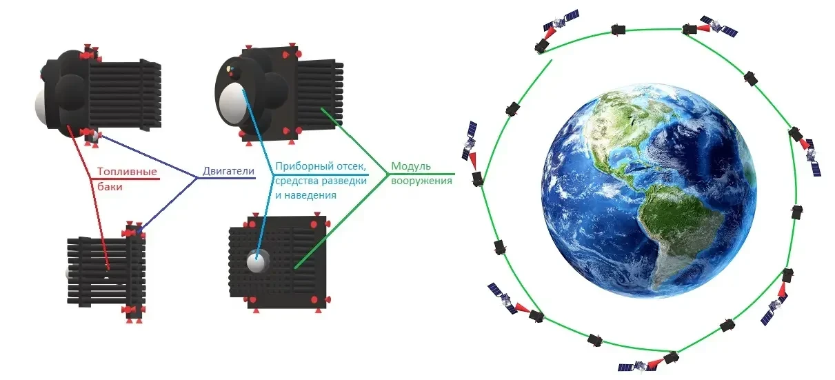Одним из наиболее реалистичных и недорогих способов массового уничтожения спутников на НОО является создание специализированных спутников-перехватчиков, способных последовательно атаковать ИСЗ противника «на пролёте», например, что-то вроде рассмотренной ранее концепции «Жнец» зачистит орбиту: можно сбивать спутники Starlink быстрее, чем Илон Маск сможет их запускать.