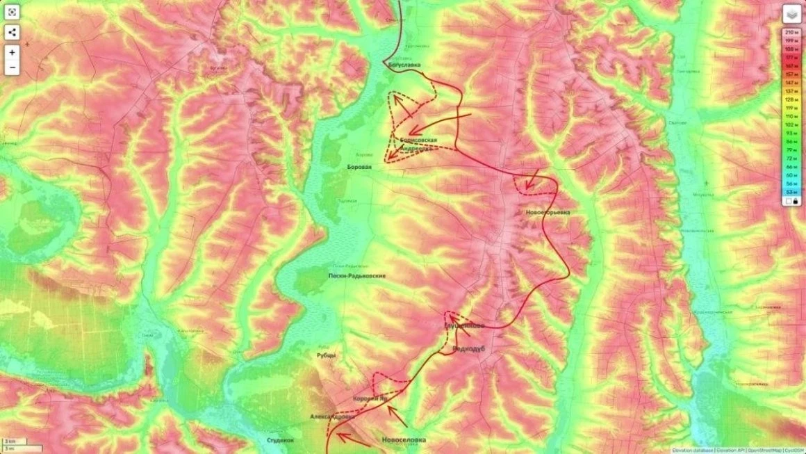Продвижение также отмечается в направлении Рубцов и Коровьего Яра. Эти действия могут быть связаны с попыткой выйти к реке Оскол - важному природному рубежу, который играет роль в организации обороны и снабжения.