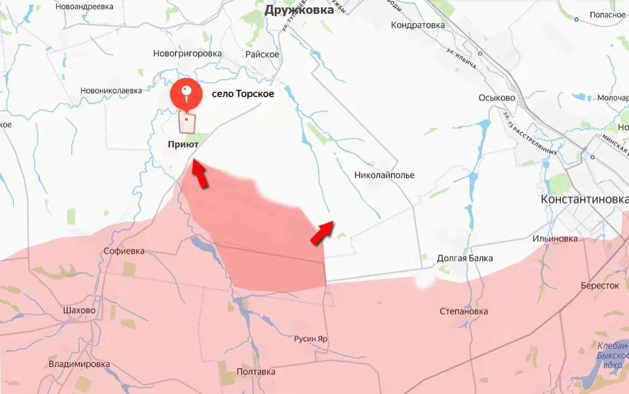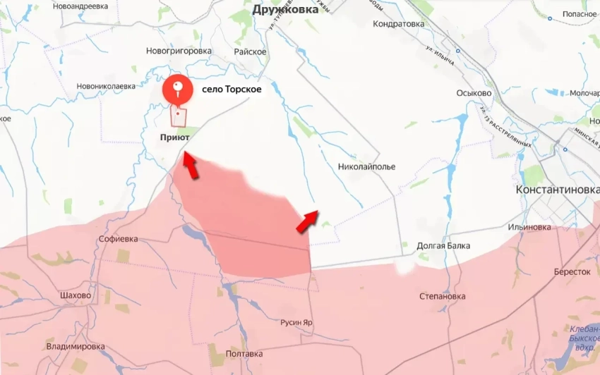 Российские войска перевели под свой контроль левый берег реки Полтавка к северу от одноимённого, ранее освобождённого, села и Русинова Яра и вышли в район сёл Торское (не путать с одноимённым селом на северо-востоке Донбасса) и Приют, уточняет "Военное обозрение".