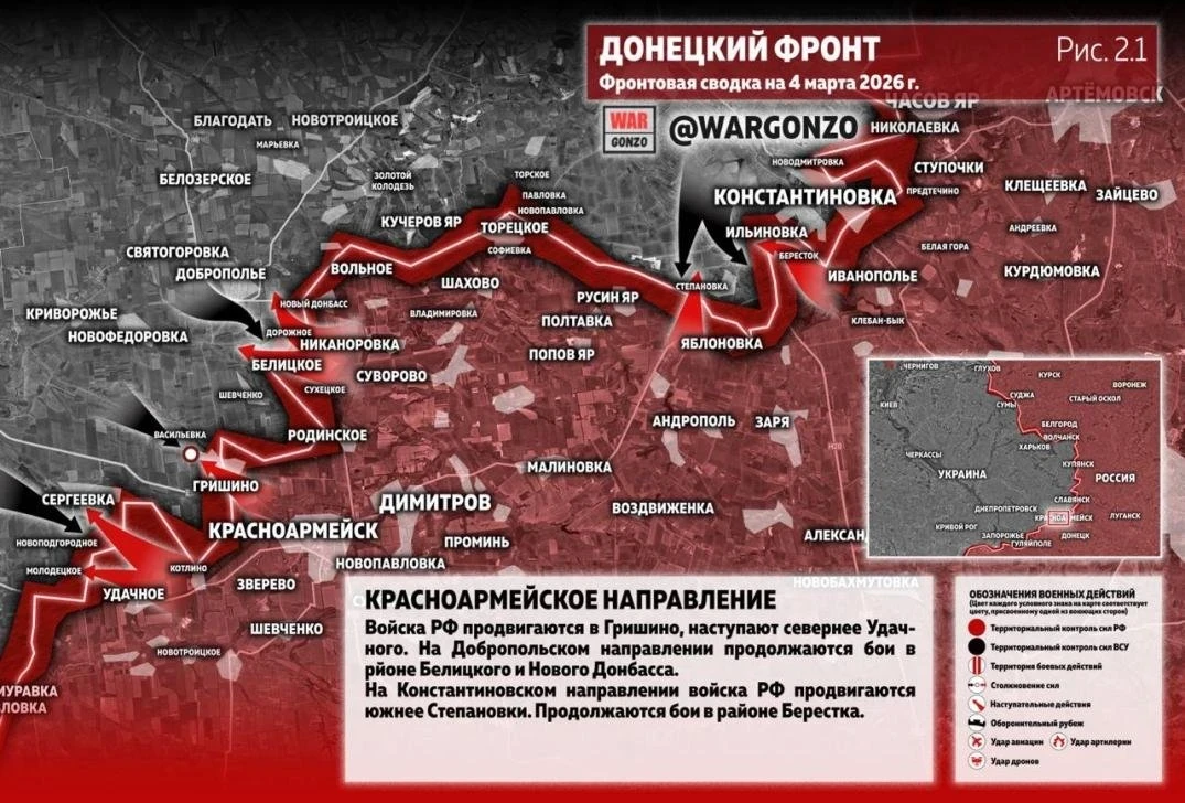 Российские войска сейчас пытаются выбить подразделения ВСУ из села Гришино, которое находится совсем рядом с Красноармейском. Ситуацию у себя в Telegram-канале описал бывший депутат Рады Олег Царев.