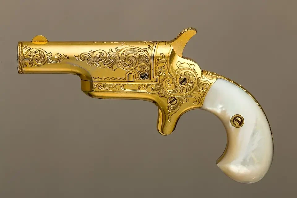 18. «Кольт-Дерринджер», ок. 1870 г. Материалы: сталь, золото, перламутр. Длина 11,7 см, длина ствола 5,9 см. Калибр 10,4 мм. Вес 198,5 г