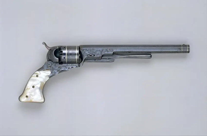 15. «Кольт-Патерсон», но уже с добавленным под ствол рычагом для тугой забивки пули. Материалы: сталь, серебро, перламутр. Ок. 1840 г. Длина 35,56 см, длина ствола 22,86 см. Калибр 10 мм