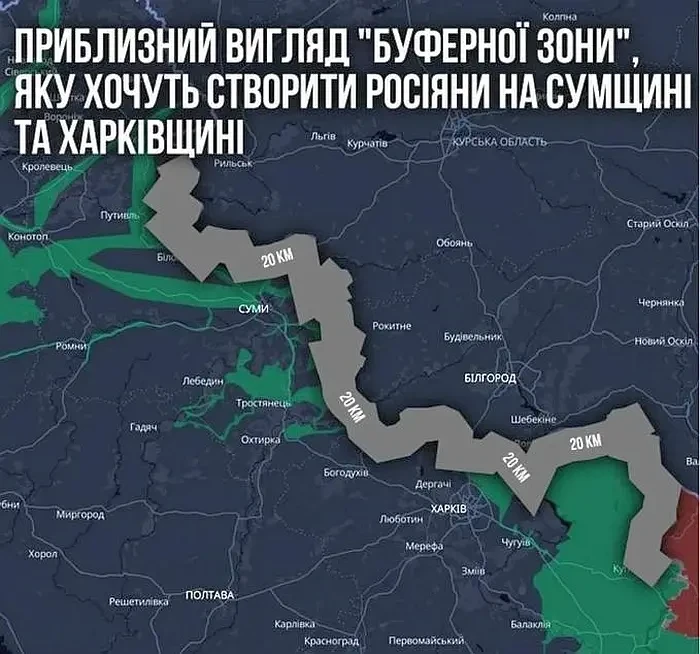 Одновременно вдоль линии границы остаётся значительное количество так называемых «серых зон», где российские подразделения ведут разведку и пытаются сформировать буферную территорию с целью наблюдения и усиления безопасности приграничных районов. Командующий Объединённых сил ВСУ генерал Драпатый рассказал украинскому СМИ, что ВС РФ стремятся создать 20-километровую «буферную зону» вдоль границы на Сумщине и Харьковщине.