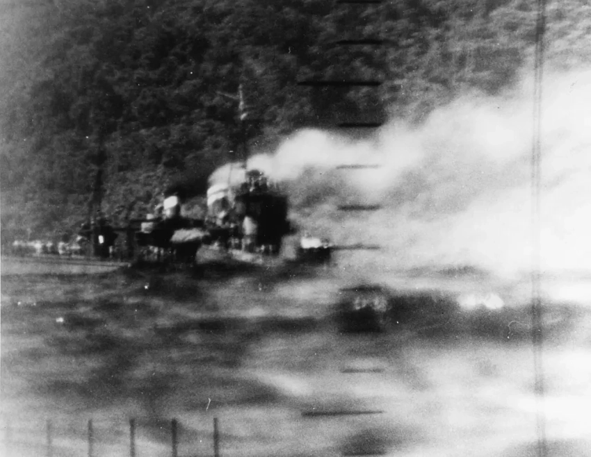 «Сигуре» и «Самидаре» обстреливают позиции союзников у Бугенвиля на Соломоновых островах за несколько часов до морского сражения у Велья-Лавелья 7 октября 1943 года.