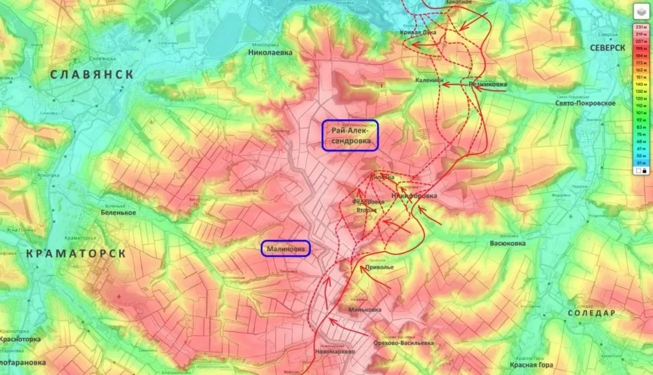 На Славянско-Краматорском фронте ВС РФ атакуют водораздельный хребет со стороны Федоровки 2-й и Приволья в направлении Малиновки. Цель - выход на канал Северский Донец-Донбасс и охват Александровки с юга.