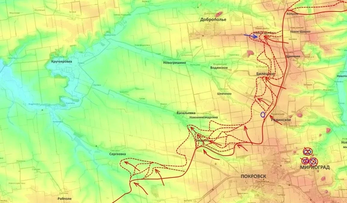 Российские подразделения ведут наступление в южной части Сергеевки, проводят зачистку Гришино и предпринимают попытки закрепиться в районах Васильевки и Александровки. Одновременно продолжаются тяжёлые бои в районе Белицкого и Нового Донбасса, где атаки и контратаки сменяют друг друга без остановки.