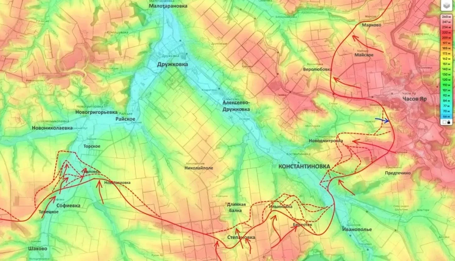 Расстояния на этой карте уже не выглядят абстрактными. До окраин Славянска от передовых позиций - чуть больше 18 километров, до Краматорска по прямой - около 20. И это не просто цифры на схеме. Это показатель того, насколько плотно сжимается дуга вокруг всей Славянско-Краматорской агломерации.