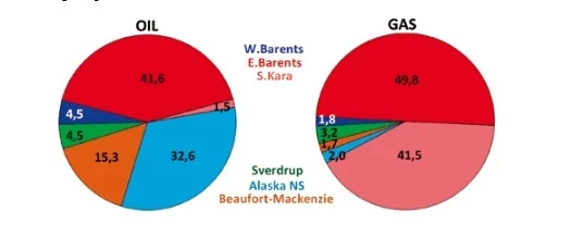 При отнесении оценочных ресурсов (провинций) к ближайшей стране с равным распределением «совместных нефтегазоносных провинций, по оценкам, на Россию приходится более половины совокупных ресурсов Арктики. В российском сегменте расположены крупнейшие запасы природного газа, в то время как крупнейшие запасы нефти сосредоточены в американском сегменте Арктики (штат Аляска).