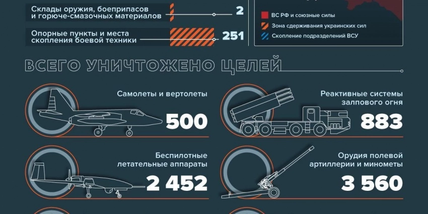 Авиацией, ракетными войсками и артиллерией поражен пункт управления 72-й механизированной бригады ВСУ в районе Пречистовки (ДНР), 67 артподразделений, живая сила и военная техника в 184 районах. В районе города Запорожье уничтожен склад боеприпасов 65-й механизированной бригады ВСУ. В районе Красноармейска (ДНР) нанесен удар по складу вооружения ВСУ — уничтожено 120 снарядов РСЗО HIMARS, 250 снарядов РСЗО «Смерч и 2 транспортно-заряжающие машины.