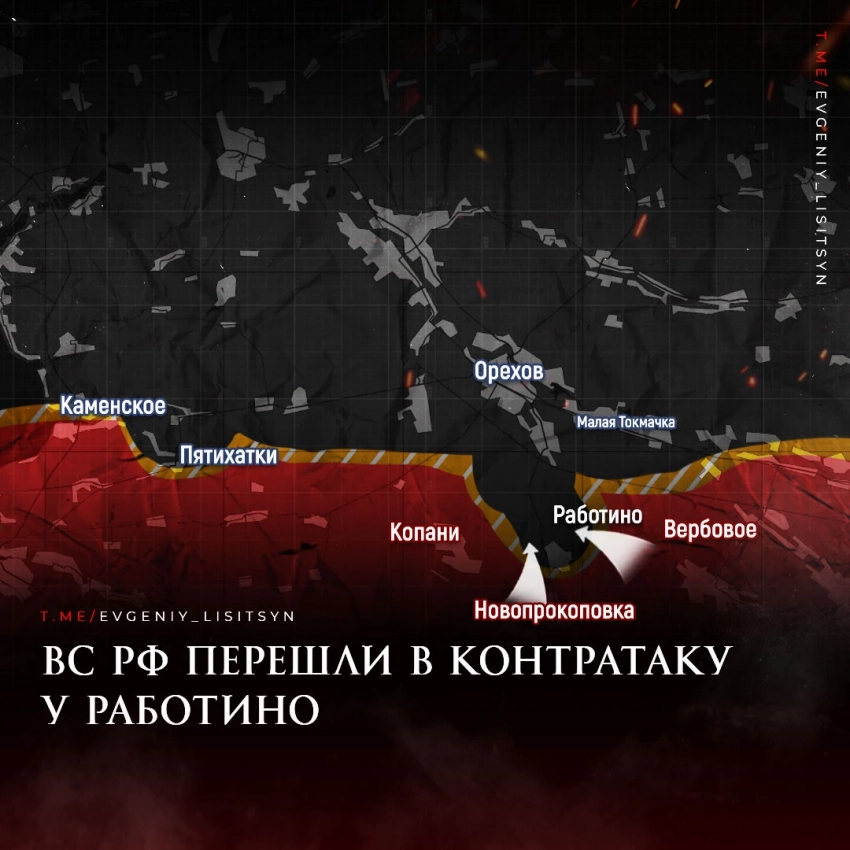 ? На Запорожском направлении: На линии Копани-Работино-Новопрокоповка-Вербовое российские войска проявили инициативу, устроив ряд неожиданных контратак. В результате этой операции, несколько подразделений ВСУ попали в тяжёлое положение. Те, кто отказался сдаваться, были уничтожены, остальные солдаты взяты в плен.