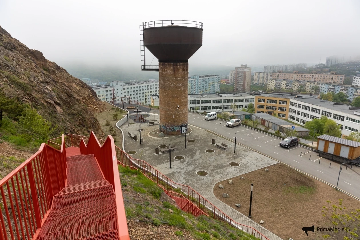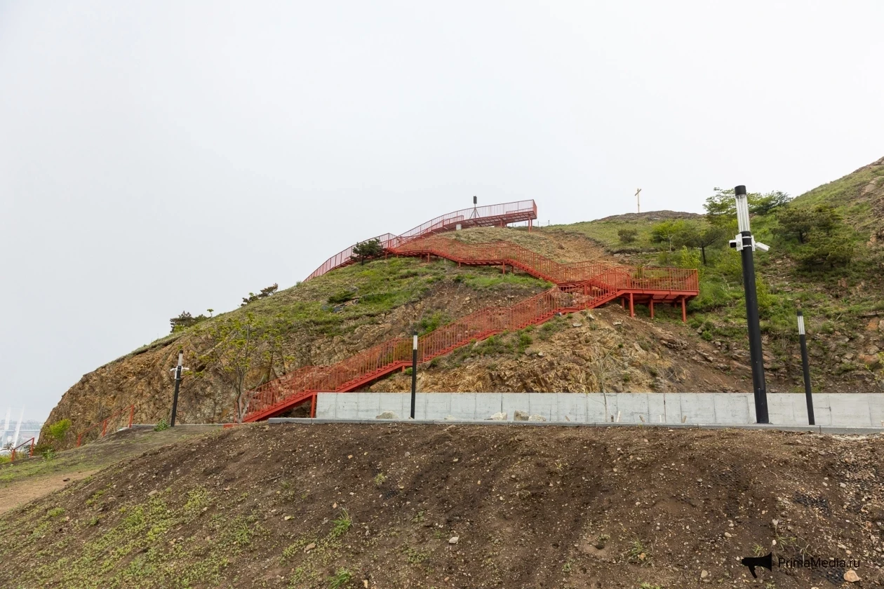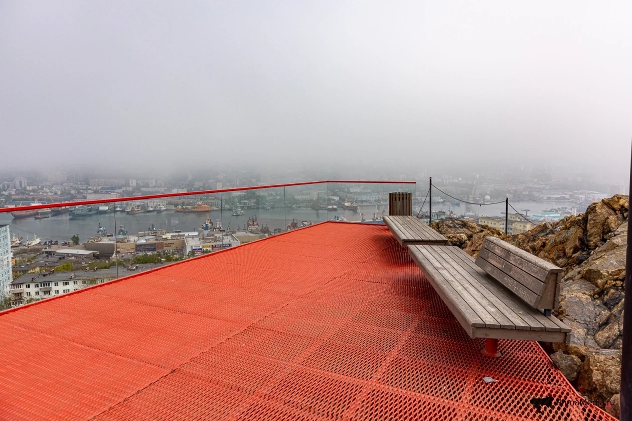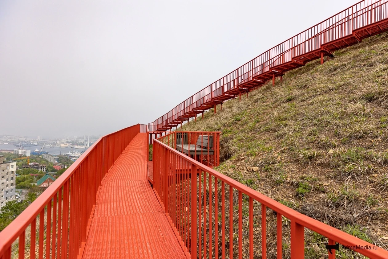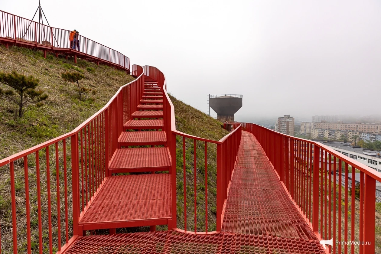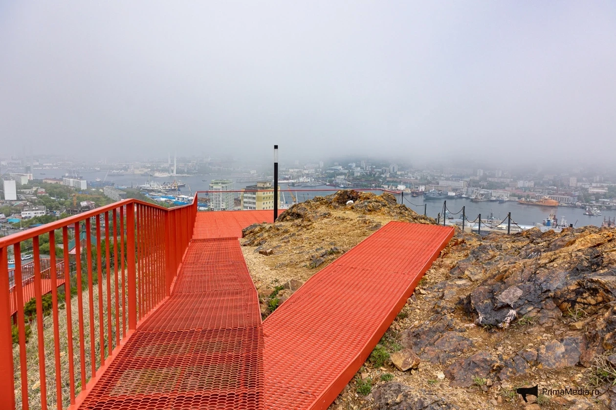 Далее путь не приносил трудностей вовсе. Комфортно проложенная серая линия асфальта сменилась красной металлической полосой лестницы, ведущей на популярную сопку Бурачка, откуда открывается прекрасный вид на туманный Владивосток и его мосты.