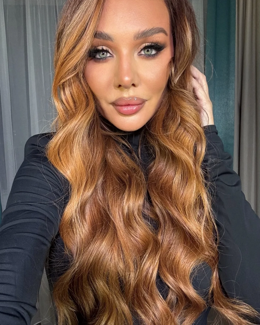 На снимках певица позирует в чёрном джемпере с высоким воротом, дополнив образ ярким макияжем и причёской с кудрями.
