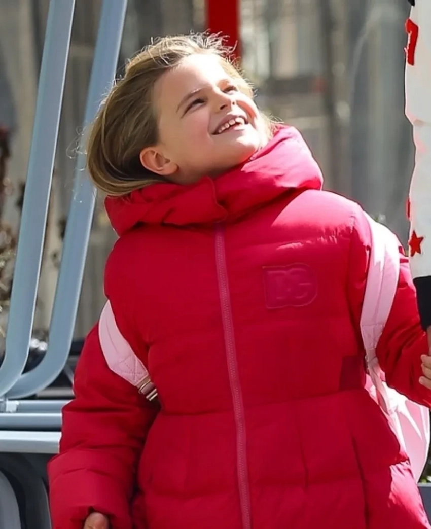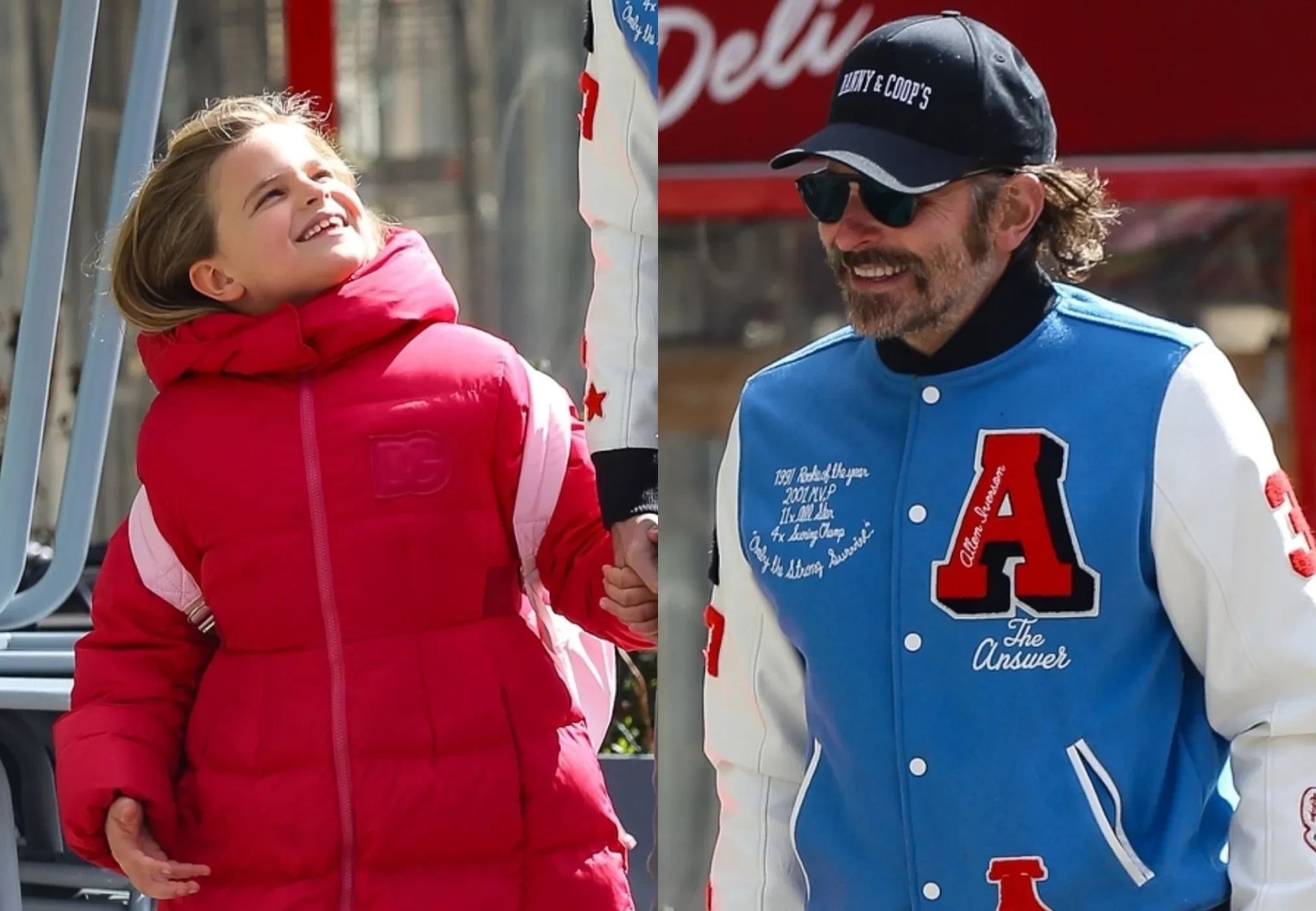 Звезда фильма "Маэстро" был одет в спортивную куртку, серые брюки и кепку, а Лея шла рядом с отцом в красном пуховике и кроссовках в тон.
