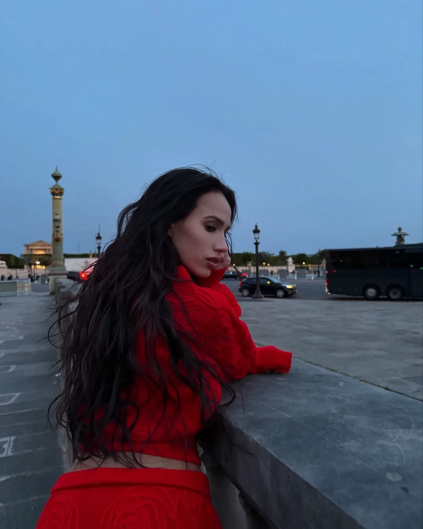 На новых снимках Алина позирует на улицах Парижа в красном жакете и микрошортах в тон. Образ она дополнила чёрными чулками и такого же цвета туфлями.