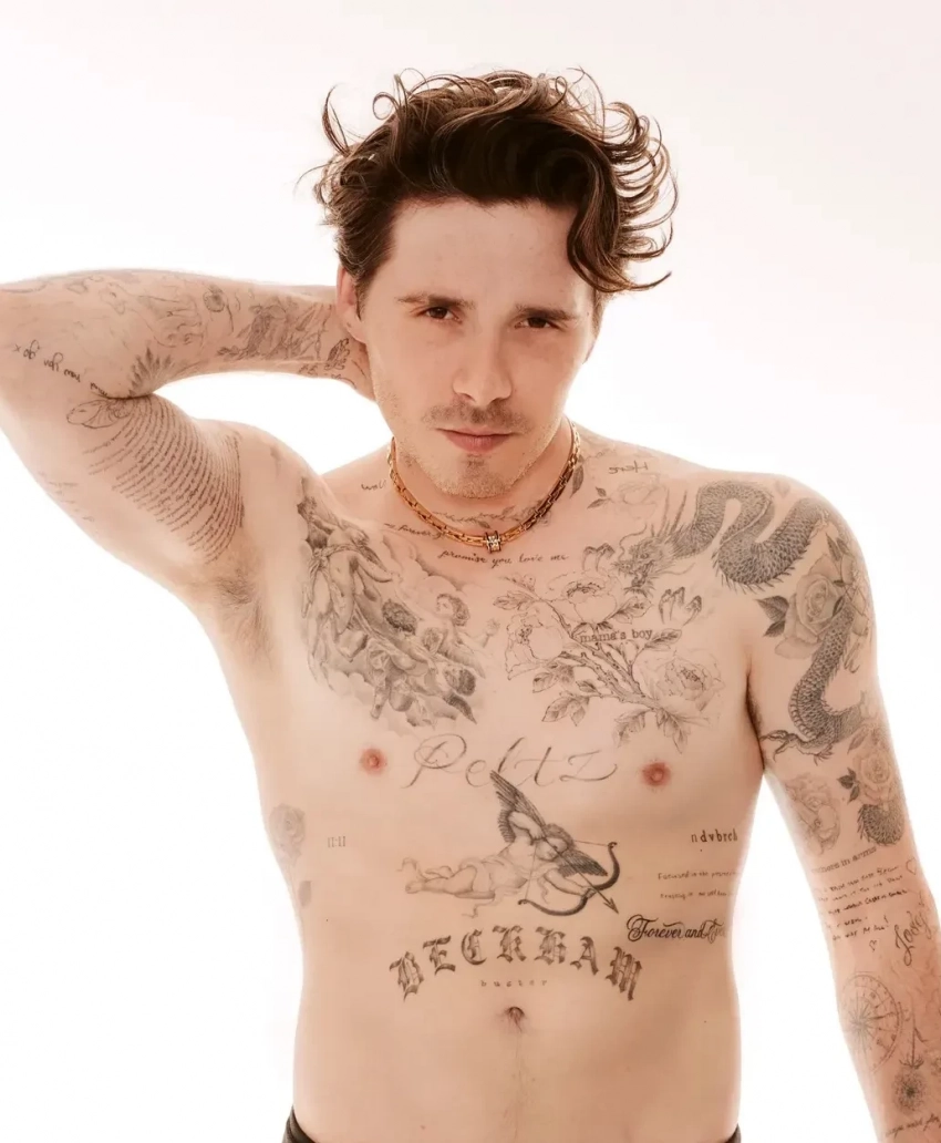 Бекхэм-младший и Пельтц снялись в фотосессии для журнала Glamour, где Бруклин продемонстрировал тело, покрытое узорами. Поклонники пары обратили внимание на то, что надпись "Мамин сын" в районе сердца у него теперь "обрамлена" цветочным рисунком и стала куда менее заметной.