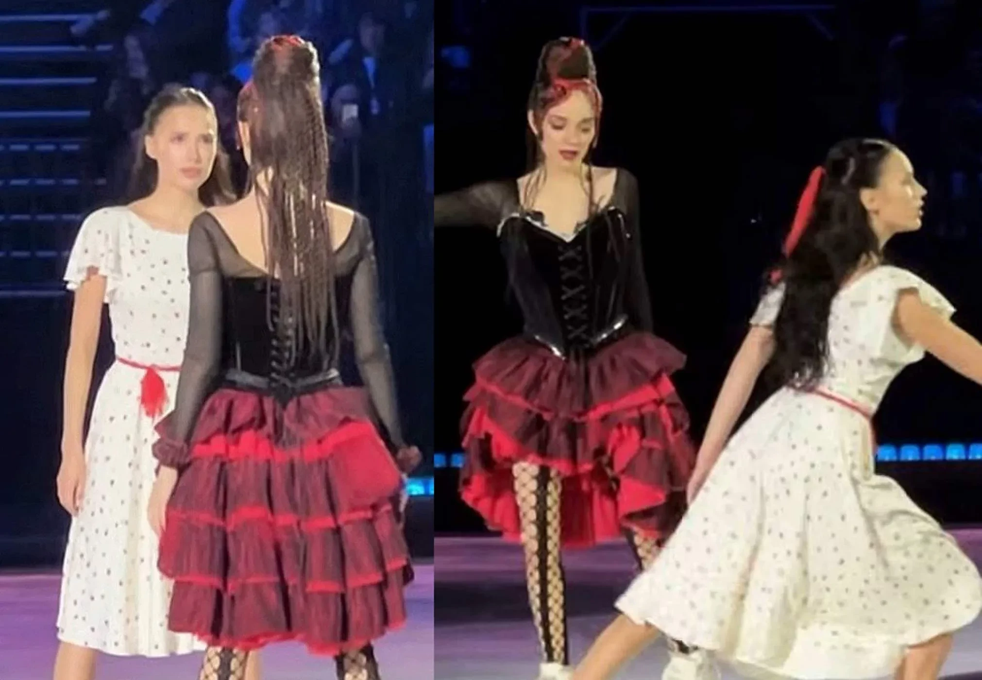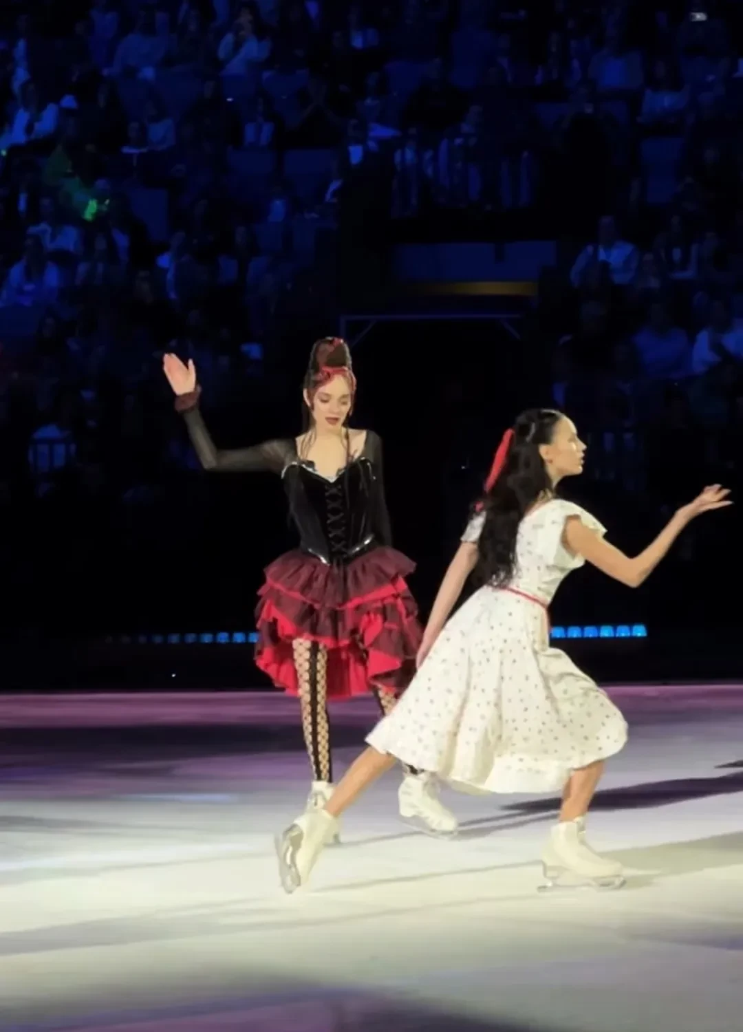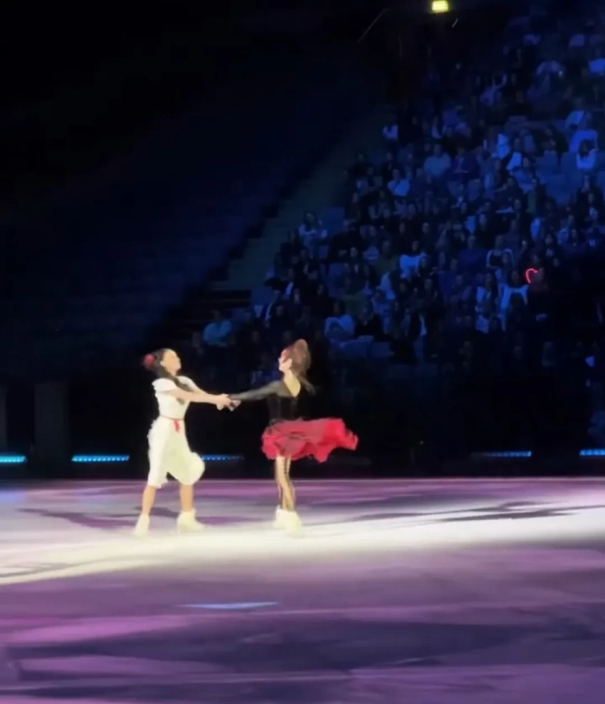 23-летняя Алина Загитова и 25-летняя Евгения Медведева вместе вышли на лёд и станцевали номер под песню “Ты прости меня”.