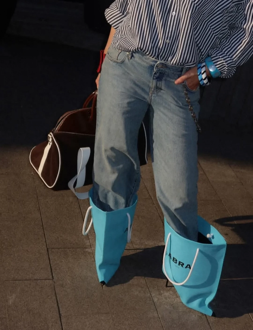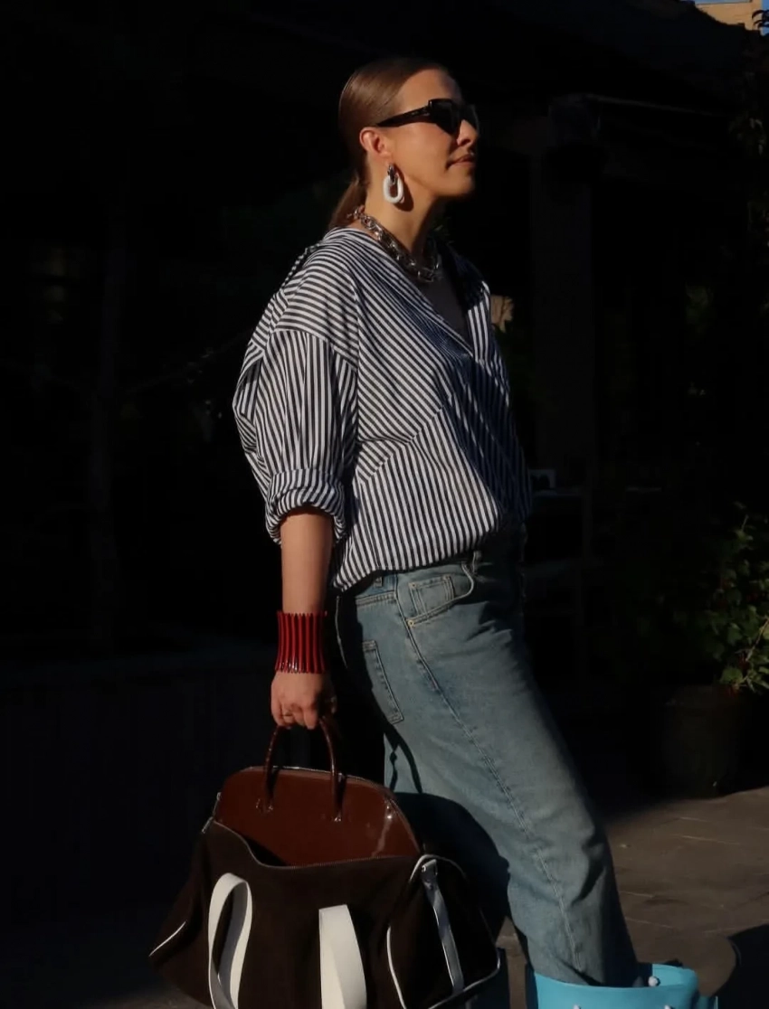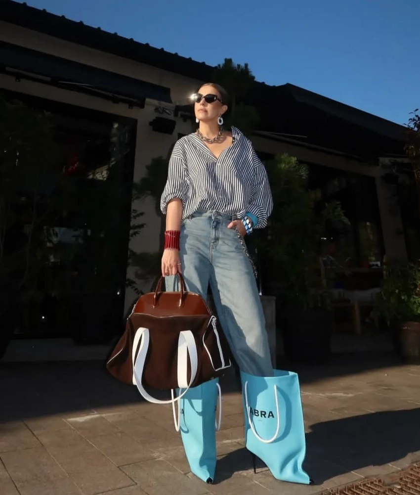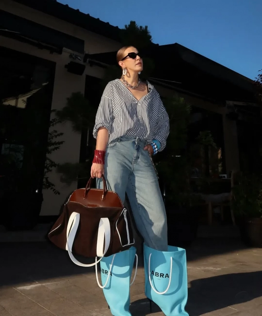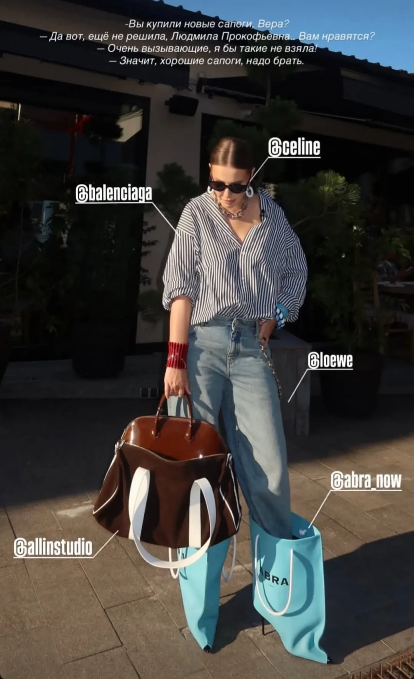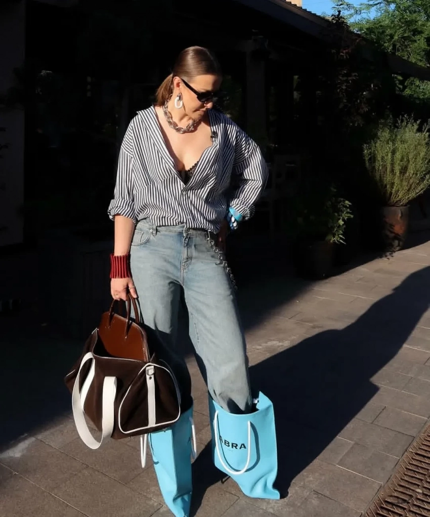 43-летняя Ксения Собчак продемонстрировала подписчикам свой новый образ. На фотографиях, которые журналистка опубликовала в своих соцсетях, она предстала в полосатой рубашке Balenciaga, джинсах Loewe и необычных сапогах Abra, выполненных в виде пакетов для шоппинга.