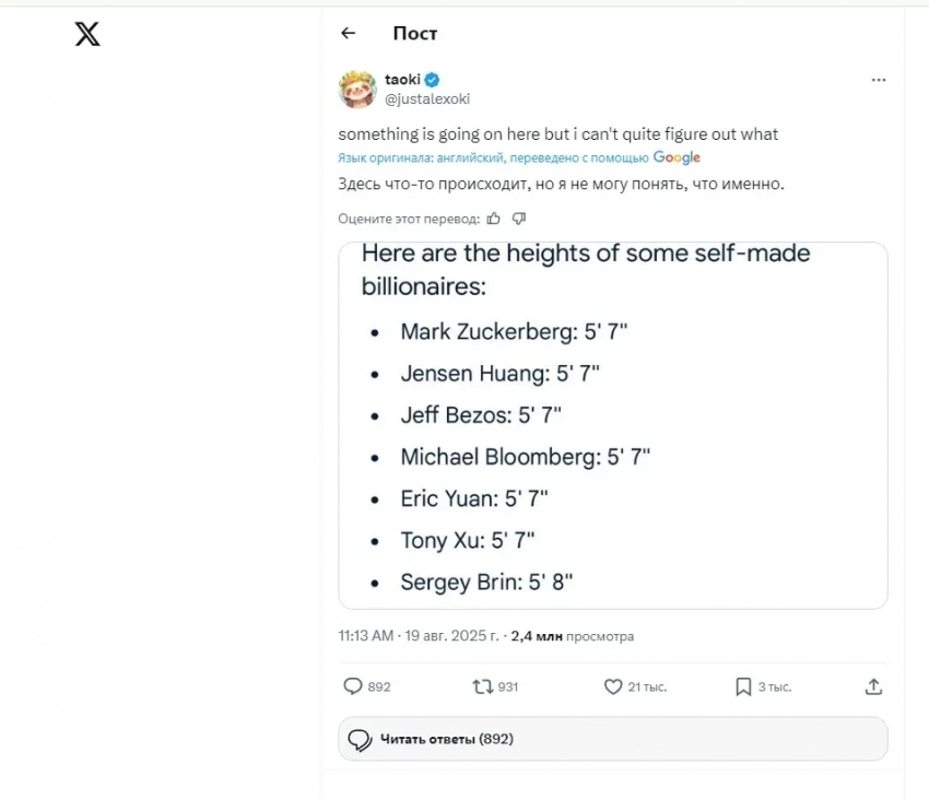 Соучредитель Meta* Марк Цукерберг и недавно женившийся владелец Amazon Джефф Безос (оба входят в тройку богатейших людей планеты) вошли в список self-made миллиардеров с низким ростом. Его составили пользователи соцсети Х (бывший Twitter).