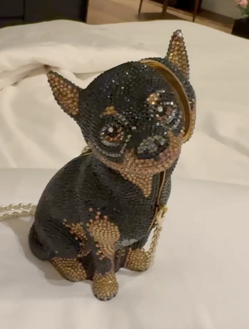 Светская львица и жена бизнесмена Олега Шелягова Виктория позировала на дорожке в чёрном кожаном платье You Wanna, а 50-летняя Яна Рудковская надела корсетное платье с кружевом. Сначала продюсер дополнила образ сумкой-пирожным Chanel, а после получила в подарок сумку в виде собаки "от Кендалл Дженнер", как она её назвала, и вышла на дорожку уже с новым аксессуаром.