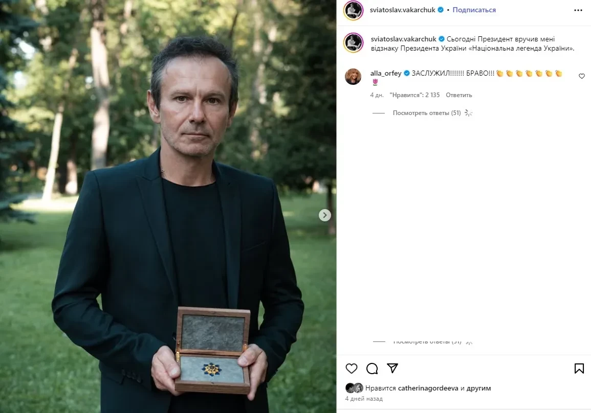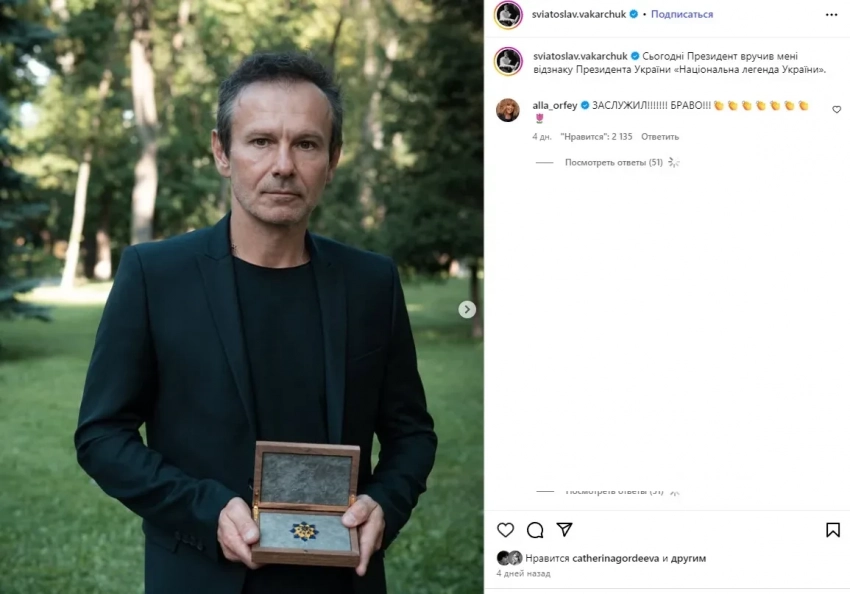Алла Пугачёва поздравила в инстаграме* лидера "Океана Эльзы" Святослава Вакарчука с наградой "Национальная легенда Украины", которую тот получил из рук президента страны Владимира Зеленского. "Заслужил! Браво", — написала 76-летняя Пугачёва под постом, в котором Вакарчук рассказал о вручении ему знака отличия (присуждается за вклад в развитие страны).