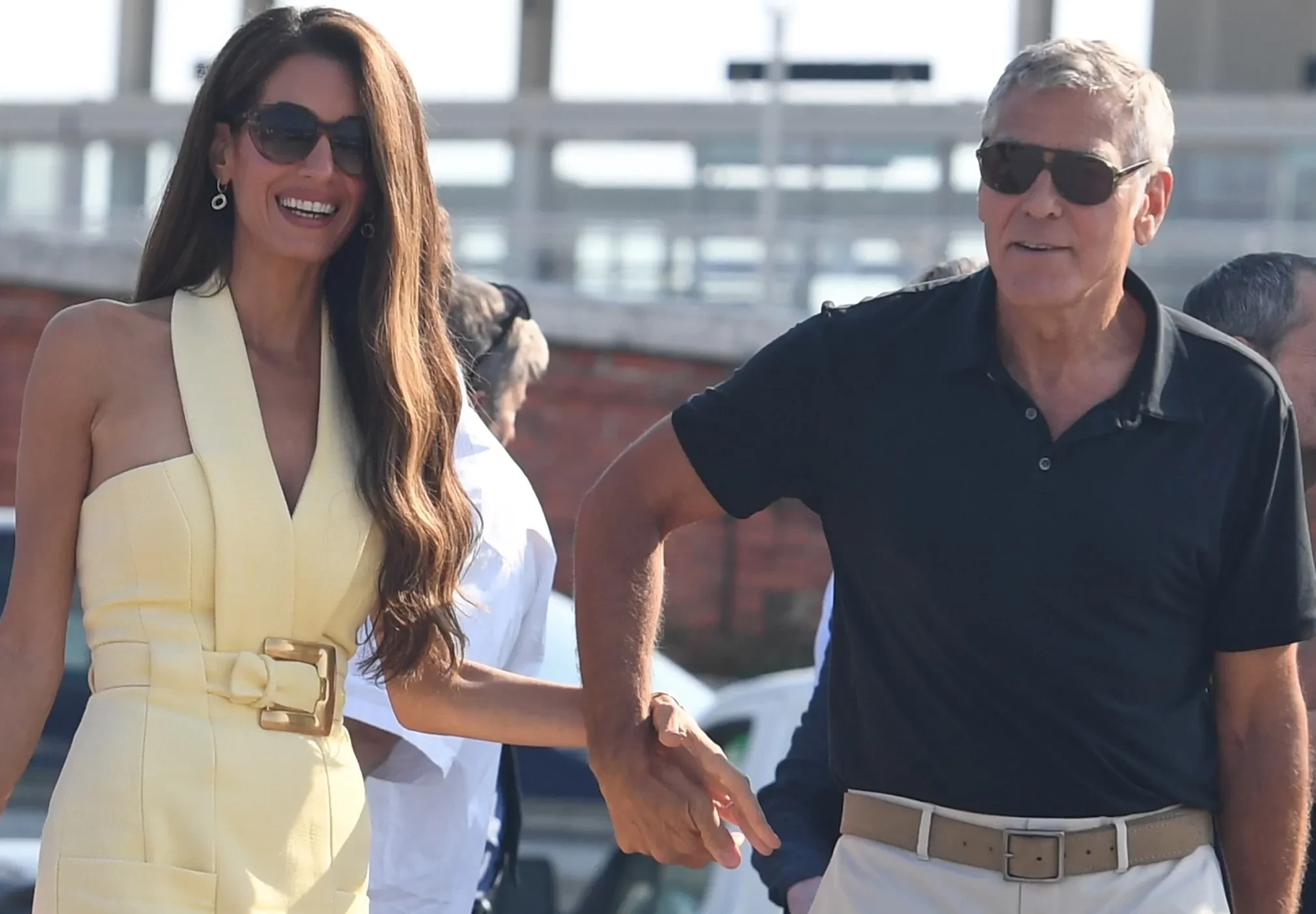 47-летняя Амаль улыбалась фотографам, держала мужа за руку и была одета так, будто готова выйти на красную дорожку: в платье Balmain цвета сливочного масла и белые туфли Prada. 64-летний Джордж выбрал более повседневный образ — светлые брюки и поло.