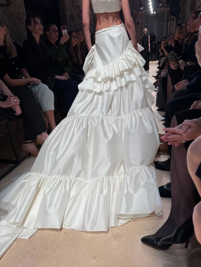 Кафельникова дефилировала в наряде, вдохновлённом образом Марии-Антуанетты. Она продемонстрировала топ из норки и пышную юбку из шёлковой тафты с оборками. По словам Ксении Соловьёвой, которая рассказала о показе в своём телеграм-канале, эта юбка стала единственным изделием, конструкцию которого Терехов не смог объяснить конструкторам. Дизайнер самостоятельно наколол ткань на манекен и затем передал её для технического воплощения.