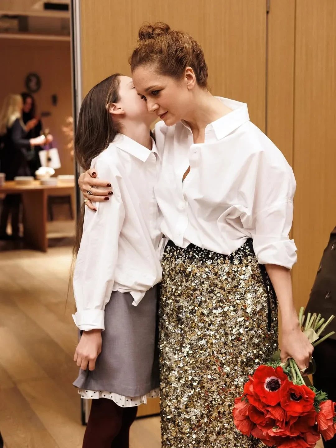 На снимках Исакова запечатлена вместе с дочерью во время мероприятия, организованного косметической компанией. На одном фото Варвара что-то шепчет матери на ухо, а её лицо скрыто, но уже на другом — и мать, и дочь смотрят вперёд. "Варя сопровождала, даже не совсем скучала, даже не сердилась, хотя ей это пока не интересно. И даже фотографировалась со мной", — подписала 49-летняя актриса пост.
