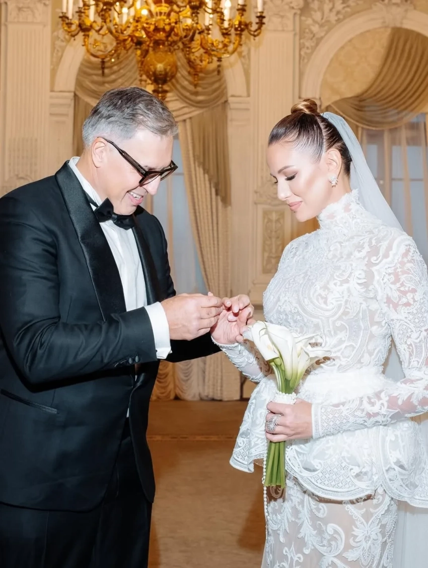 Невеста была в платье от дизайнера Александра Сирадекиана. Бракосочетание прошло в популярном среди селебрити Дворце бракосочетания № 1 на Английской набережной Санкт-Петербурга. Молодожёны также устроили фотосессию в местном пятизвёздочном отеле "Астория" и посетили храм.