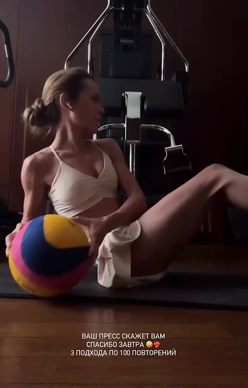На снимках дочь певца Дмитрия Маликова позирует в спортзале в коротком топе и шортах. Она выполняет упражнения с мячом — по три подхода по 100 повторений, а есть предпочитает овсянку, творог и джем. "В здоровом теле — здоровый дух! Доброе утро", — написала Маликова под фото. После тренировки она сходила к косметологу и показала селфи без макияжа.