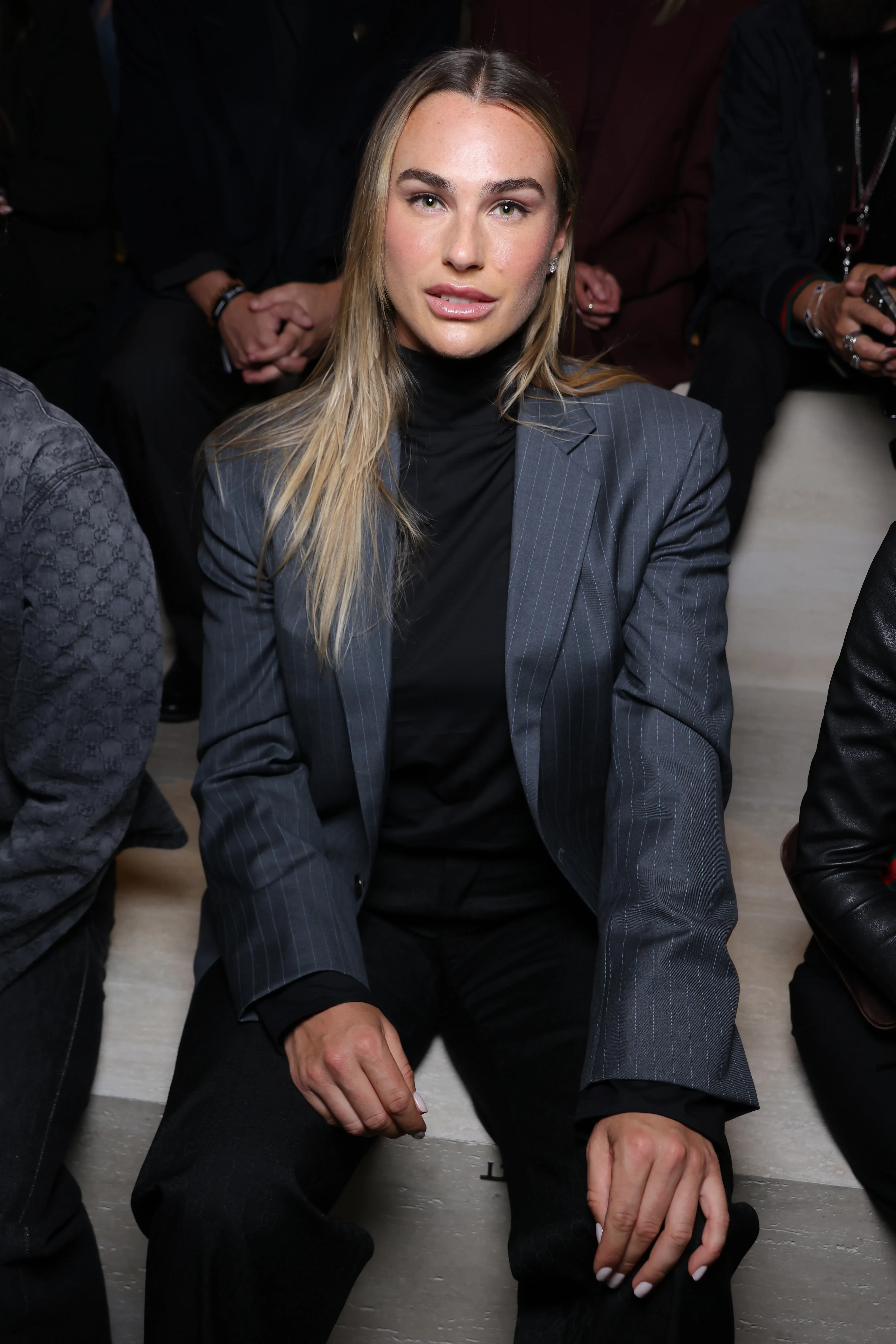 Деми МурДеми Мурhttps://t.me/spletnik2006/49603Не смогла пропустить показ и давняя подруга Демны, 59-летняя Рената Литвинова. Актриса пришла в сером платье-накидке с отделкой из новой коллекции, а её 24-летняя дочь Ульяна Добровская выбрала красное платье-пальто (его же надела Донателла Версаче) и чёрную мини-юбку. 27-летняя первая ракетка мира Арина Соболенко, которая в начале года стала лицом Gucci, позировала фотографам в пиджаке в полоску, чёрной водолазке и классических брюках.