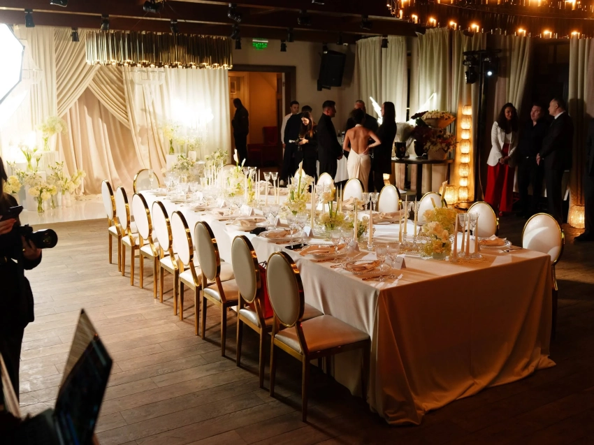 Интерьер вечеринки и даже праздничный торт были выдержаны в бело-золотых тонах. Актриса за вечер сменила два образа: сначала она появилась в белом платье с открытой спиной, а позже надела платье с корсетом. 38-летний Павел Прилучный выбрал для праздника чёрный костюм.