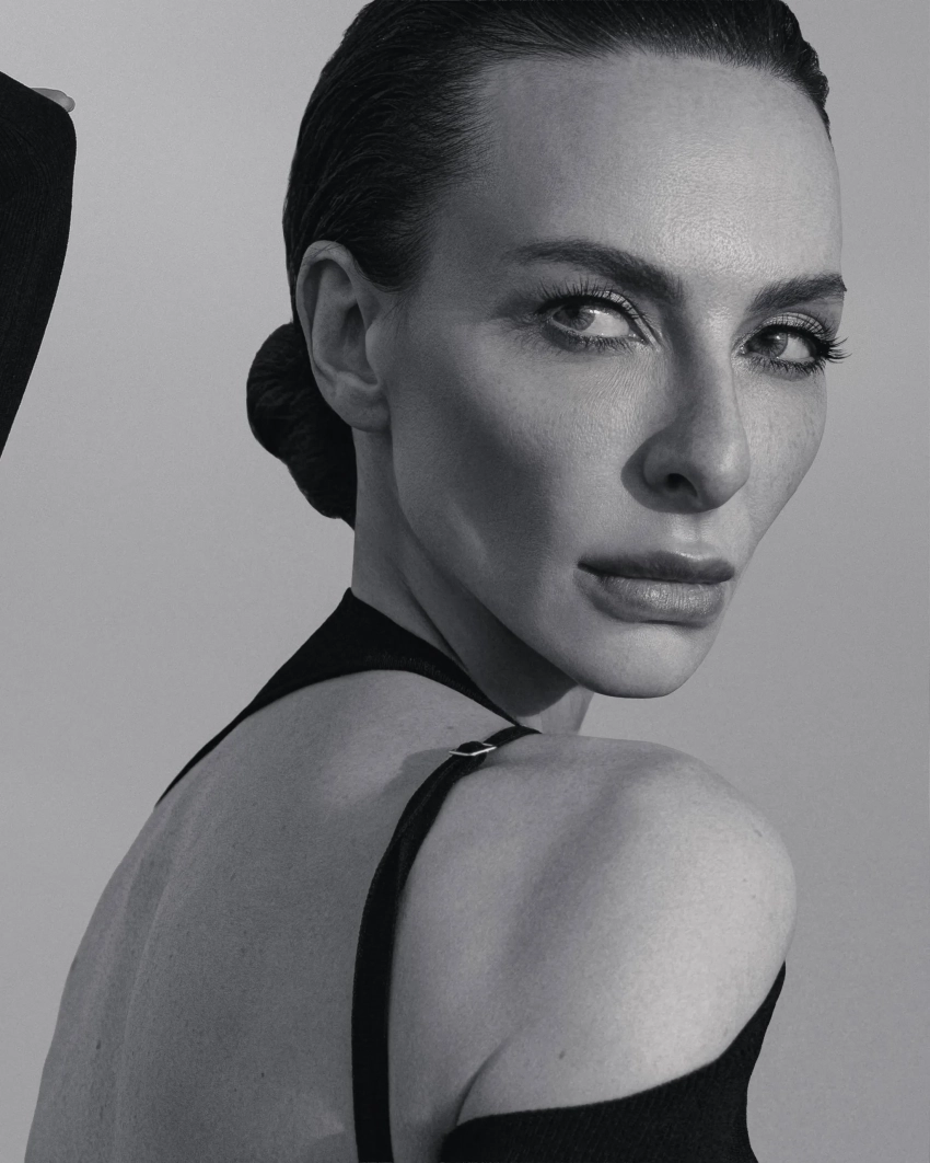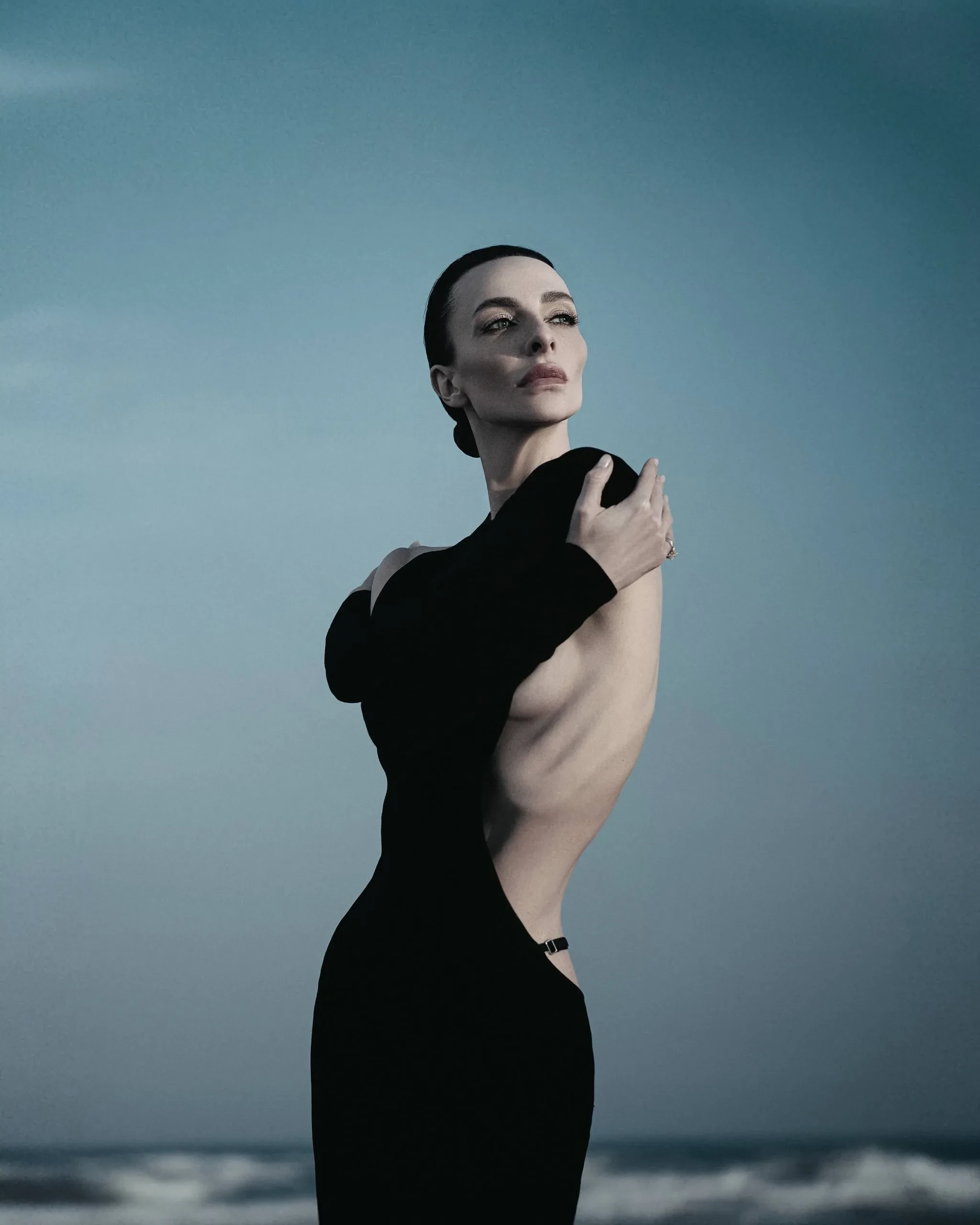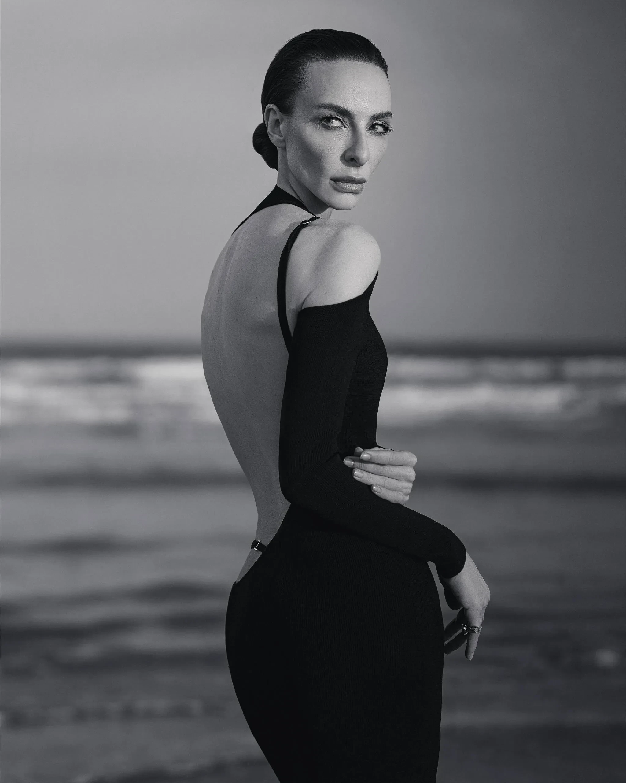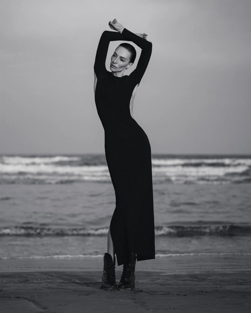 Для съёмки 41-летняя Варнава попозировала на побережье в длинном чёрном платье с асимметричным вырезом в области спины, частично обнажающим грудь.