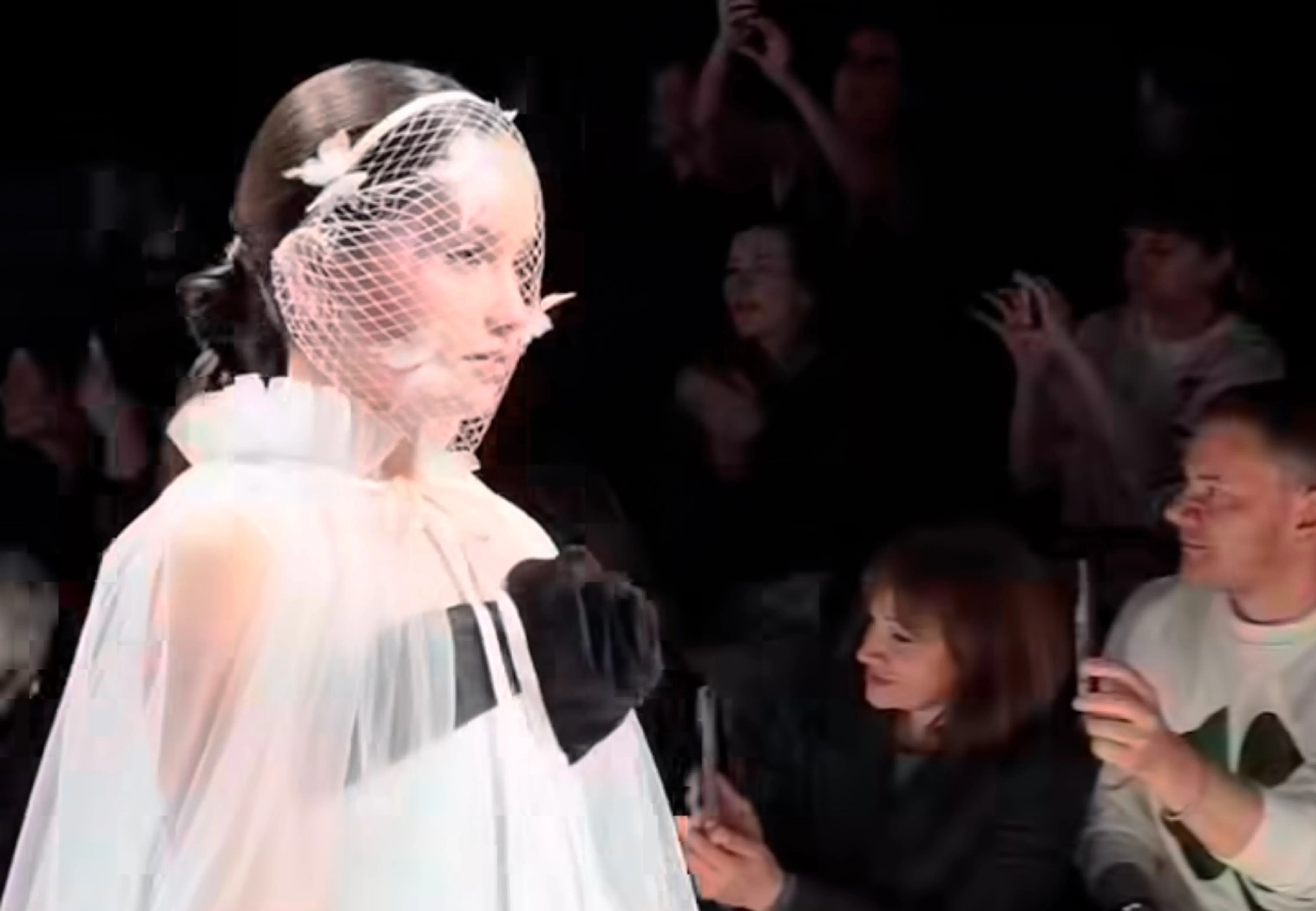 https://t.me/spletnik2006/50834Мия ПрилучнаяМия продефилировала в пышном белом платье с акцентной черной лентой, украшающей лиф. Поверх плеч была надета прозрачная накидка в пол, а лицо обрамляла вуаль в белую сетку с бабочками.