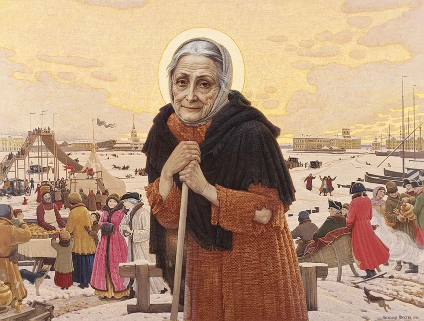 Жители Санкт-Петербурга второй половины XVIII века хорошо знали скиталицу, в любую погоду одетую в жалкое рванье цвета военной формы ее мужа: красную кофту, зеленую юбку. Стоило Ксении появиться на рынке, как всякий рвался ей услужить. Купцы распахивали прилавки: бери — не хочу. Извозчики, издали приметив красно-зеленые лохмотья, гнали лошадей, упрашивая блаженную проехаться с ними хоть пару шагов. Народ знал: блаженная не возьмет себе ни одежду, ни обувь, какие бы ветра или лютый мороз ни студили столицу. Себе не возьмет ничего, ей ничего и не нужно — входя в дом,