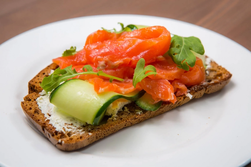 Среда: цельнозерновые тосты с лососем и свежим огурцом.