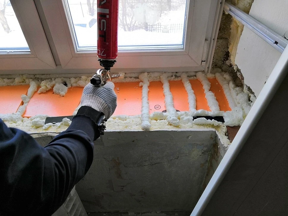 Если холод «тянет» снизу, проблема может скрываться под подоконником. Со временем утеплитель в этой зоне разрушается или оседает. Щель между стеной и подоконником очищают от старых материалов и мусора, после чего заполняют монтажной пеной.