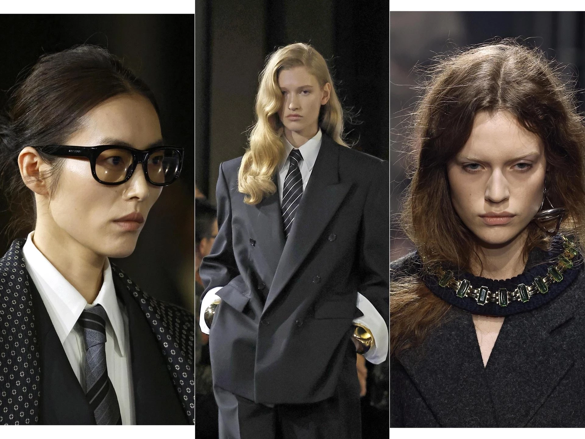 Saint Laurent делает ставку на массивные украшения — крупные браслеты, кольца с цветными (но не драгоценными) камнями, заметные серьги. Они добавляют яркости даже самому сдержанному деловому костюму. В 2025 году аксессуары — не дополнение, а полноценная часть лука. Это легкий способ разбавить офисную строгость и подчеркнуть свою индивидуальность.