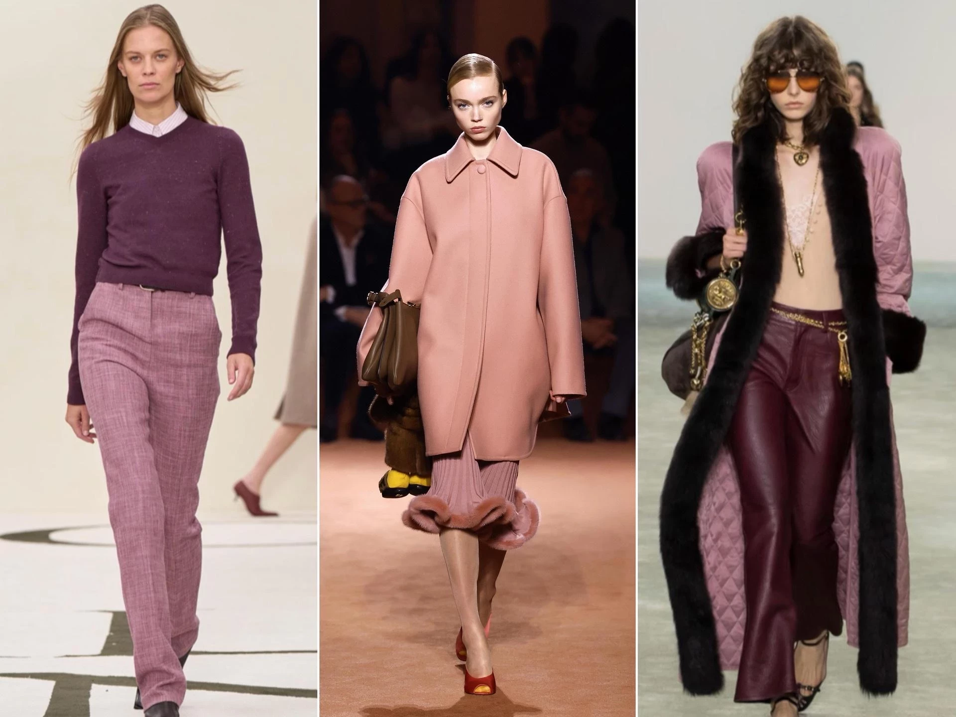 У бренда Bibhu Mohapatra йогуртово-розовый встречается в длинном кашемировом пальто. Но особенно эффектно он смотрится в дуэте с баклажановым — насыщенным фиолетовым оттенком. Это сочетание делает образ дорогим и утонченным, подчеркивая индивидуальность. А дополняющие его аксессуары — например, цветные перчатки — подчеркивают тренд на яркие детали, который сохранится с весны 2025 и в осеннем сезоне.